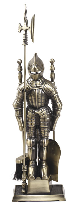 Данный нкаминный набор на подставке в виде рыцаря состоит из четырех необходимых для ухода предметов: кочерга (багор, стилизированный под орудие в руке рыцаря), щипцы, веник и совок. Изготовлен этот набор из высокопрочной стали и чугуна, оформленные под античную бронзу. Каминный набор Рыцарь украсит и дополнит ваш интерьер благодаря своей эксклюзивности и функциональности.