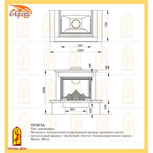 Каминная облицовка ТУЛУЗА изготовлена из натурального полированного мрамора кремового цвета и натурального мрамора с обработкой "Антик" бежево-коричневого цвета. Предназначена для оформления топок с прямым стеклом с шириной фасада 700 мм.
