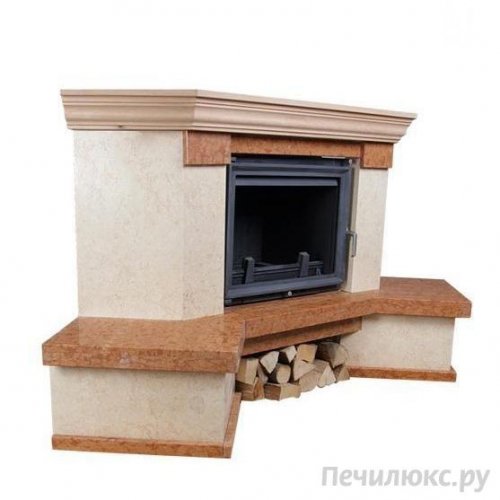 Представлена бюджетная каминная облицовка в угловом исполнении. Каминная облицовка выполнена из натурального полированного мрамора Rosso Verona, Giallo Reno с дубовой балкой. В связи с тенденцией к использованию каждого сантиметра имеющейся площади, владельцы загородных домов ищут способы активно использовать каждый квадрат жилого пространства. Опыт показывает, что угол в доме чаще всего остается не задействованным, поэтому именно в нем целесообразно разместить камин. Таким образом можно убить сразу двух зайцев: установить угловой камин в своем доме, сэкономив площадь жилища, и отлично украсить интерьер помещения, ведь из угла огонь видно практически из любого места в комнате.