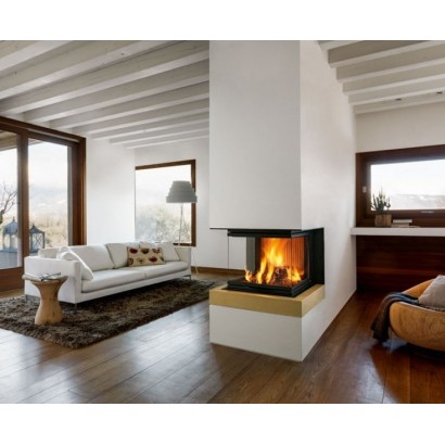 Облицовка камина довольно компактна и хорошо подходит для комнат с небольшой площадью. Основание камина сделано из мрамора, стальной вертикальный элемент отделан черной эмалью. Топка имеет три панели из огнеупорного стекла, что позволяет особенно подчеркнуть красивый вид пламени. Камин совместим с топками: MA 274 SL.