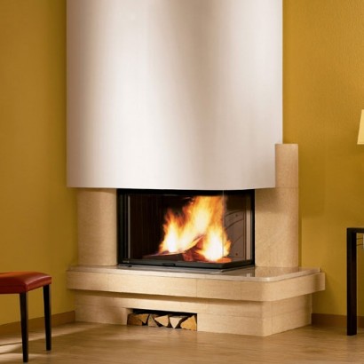 Угловой реверсивный камин из камня Dordogne.
