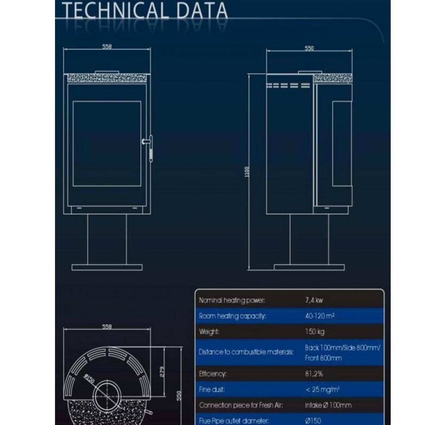 - Диаметр дымохода, (мм) 150 мм.