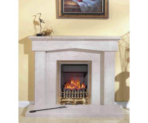 Этот строгий портал выполнен из мрамора светлого оттенка. Золоченое обрамление очага лишний раз подчеркивает естественную красоту живого огня.