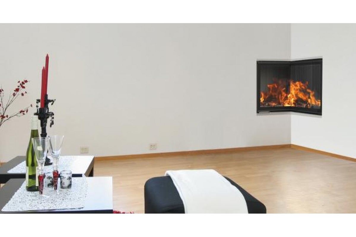 - Топка оснащена регулировкой подачи первичного и вторичного воздуха, а также системой самоочистки стекла, благодаря которой стекло всегда остается чистым. Она имеет прямое стекло, дверь открывается в сторону.
