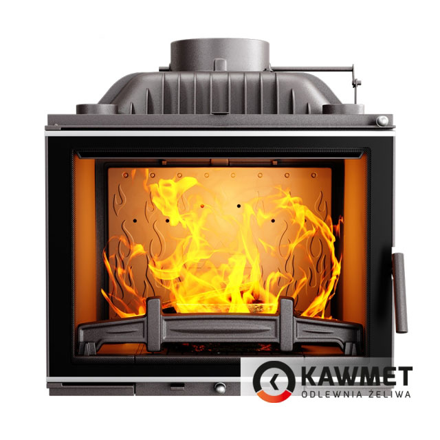 Повышенный КПД и теплоотдачу обеспечивает чугунный дефлектор, который расположен над камерой сгорания каминной топки KAWMET. Назначение дефлектора - направить недогоревшие частицы дровяного газа в центральную часть камеры сгорания, где происходит повторное догорание. Также дефлектор увеличивает тепловую эффективность топки путем удлинения пути прохождения продуктов сгорания.