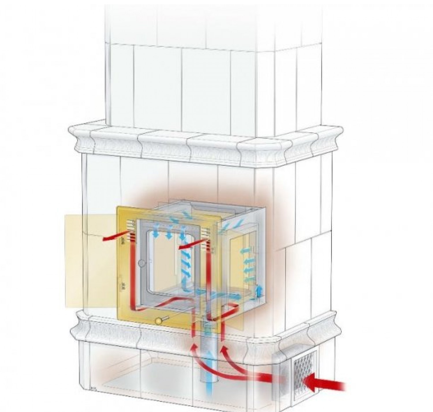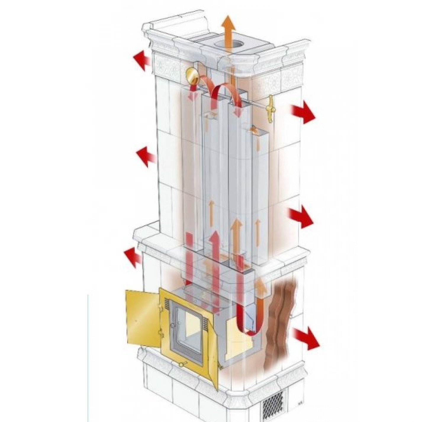 Коэффициент полезного действия, или доля используемой энергии по отношению к полученной при сгорании дров энергии, составляет целых 87%. Печи оборудуются уникальной секцией горячего воздуха с выводом тепла на фронтальную сторону печи, что ускоряет нагрев помещения. Секция горячего воздуха может дополняться вентилятором, который равномерно распределяет тепло по помещениям. В доме с принудительной вентиляцией рекомендуется подключать канал подвода воздуха снаружи напрямую к печи.
