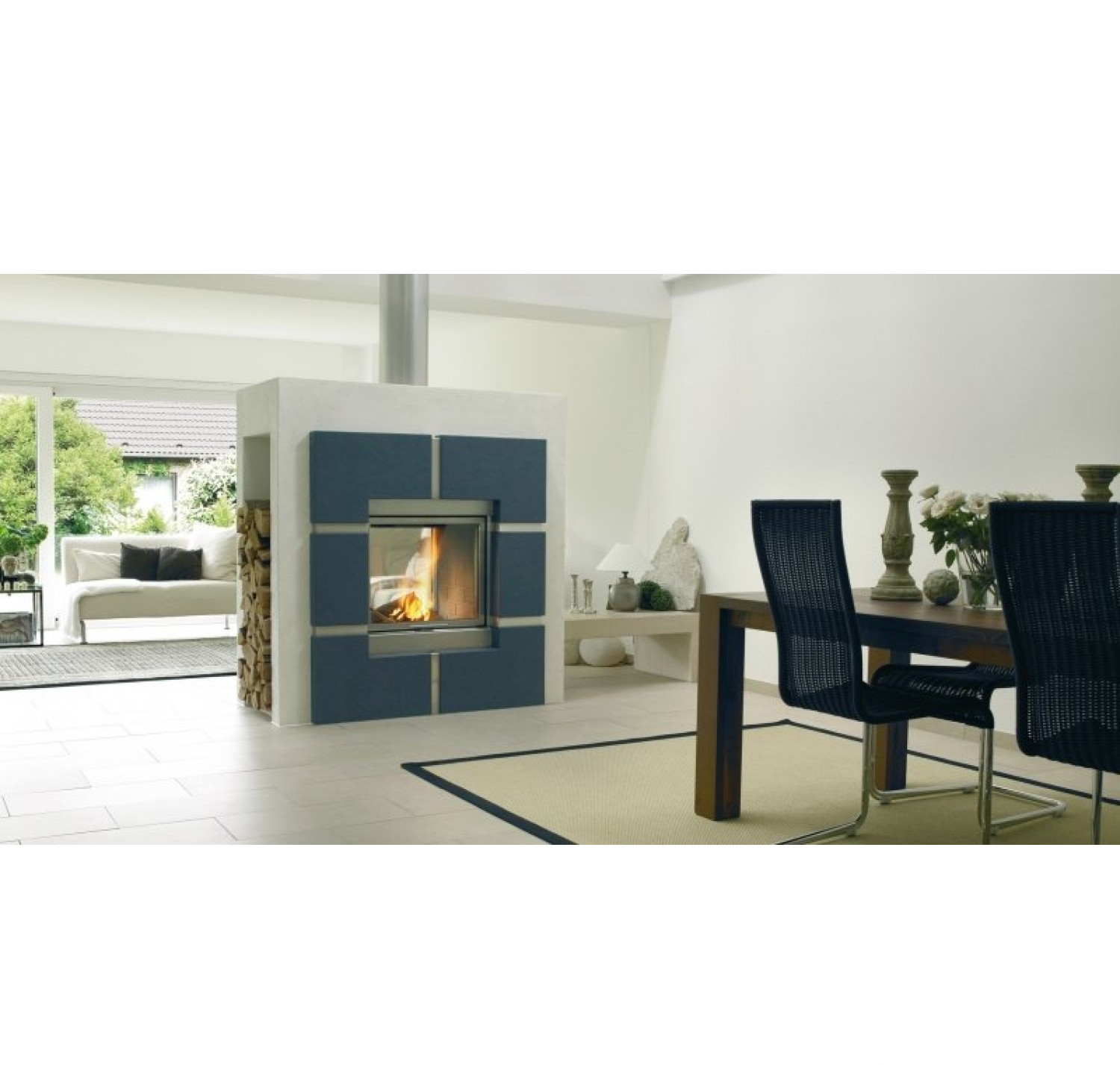 Фасад каминной топки Varia FDh 4s имеет тонированный край, облаченный в тонкую металлическую рамку по всему периметру дверки . Дизайн фасада подчеркнуто современен.