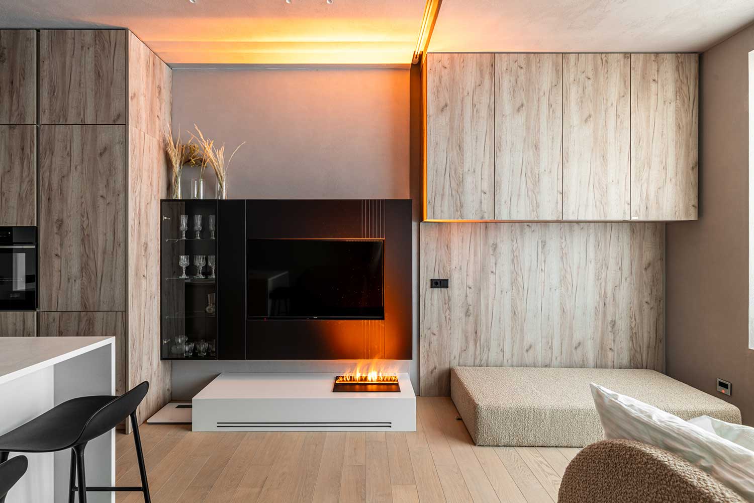 Камином можно управлять при помощи Bluetooth пульта ДУ – включать и выключать, менять интенсивность пламени. Очаг предназначен для встроенного размещения в квартире или загородном доме, камин также украсит холл отеля, бизнес-центра, ресторана или торгового центра.